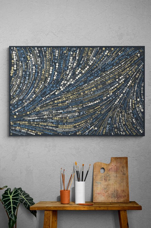 This unique abstract wall art print pattern is not drawn, but code-grown. Created using a complex Perlin Noise algorithm, the artwork simulates natural, fluid movement and turbulence, resulting in a distinct, spiraling pattern that is infinitely detailed. At every location along this algorithmic flow, a precise dot is placed, forming an intricate vortex of organic movement. Because the color of each dot is governed by a calculated chance within a sophisticated palette, your piece is a truly one-of-a-kind expression of the algorithm.