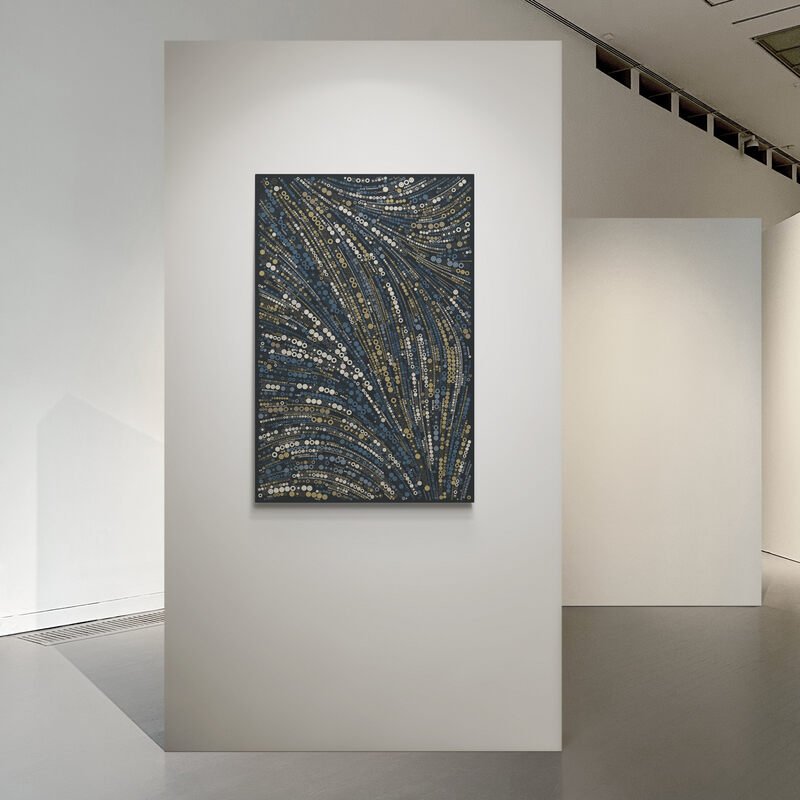Aluminum Print Artwork infused onto a sleek aluminum surface. Provides a high-gloss, ultra-modern finish that emphasizes the geometric precision of the dot pattern.