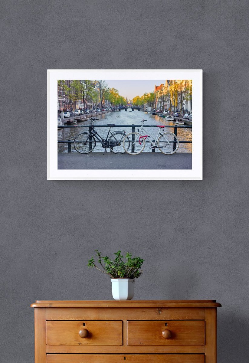 This Amsterdam Bicycle Wall Art is the culmination of a week-long visual pursuit. I imagined this perfect composition the bicycles, the light, and the clear canal view—but the moment proved elusive. Finally, when I was ready to give up, I saw these two bicycles perfectly positioned on a bridge in the distance. What followed was a frenzy: I rushed across the street, quickly and politely cleared the road of pedestrians, and set the composition in seconds to secure the frame I had carried in my mind all week.
