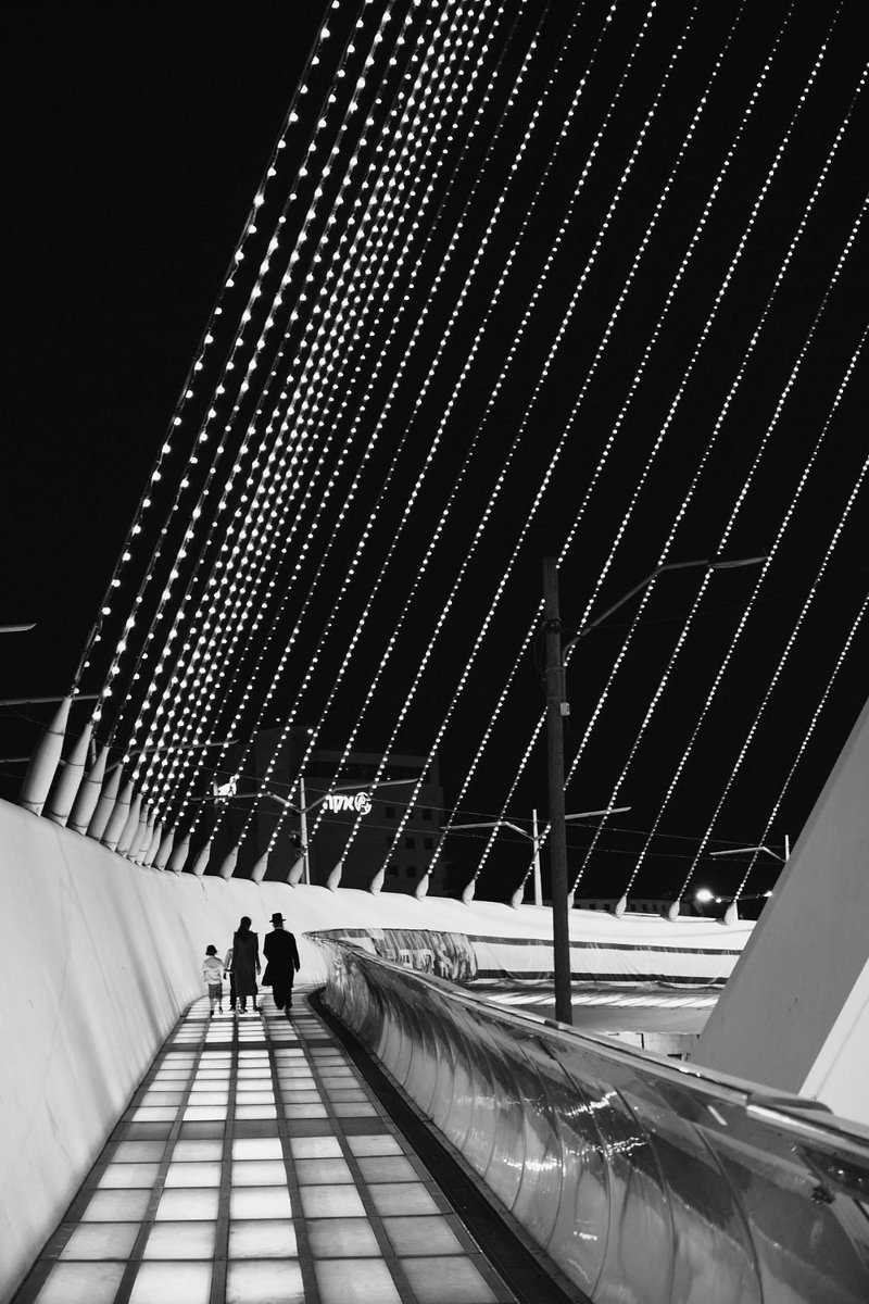photograph captures a powerful and fleeting moment in modern Jerusalem: a Hassidic family returning home just as Shabbat concludes. The scene is set on the spectacular architectural bridge at the city’s entrance, where the sleek, illuminated design contrasts dramatically with the traditional attire of the family below.