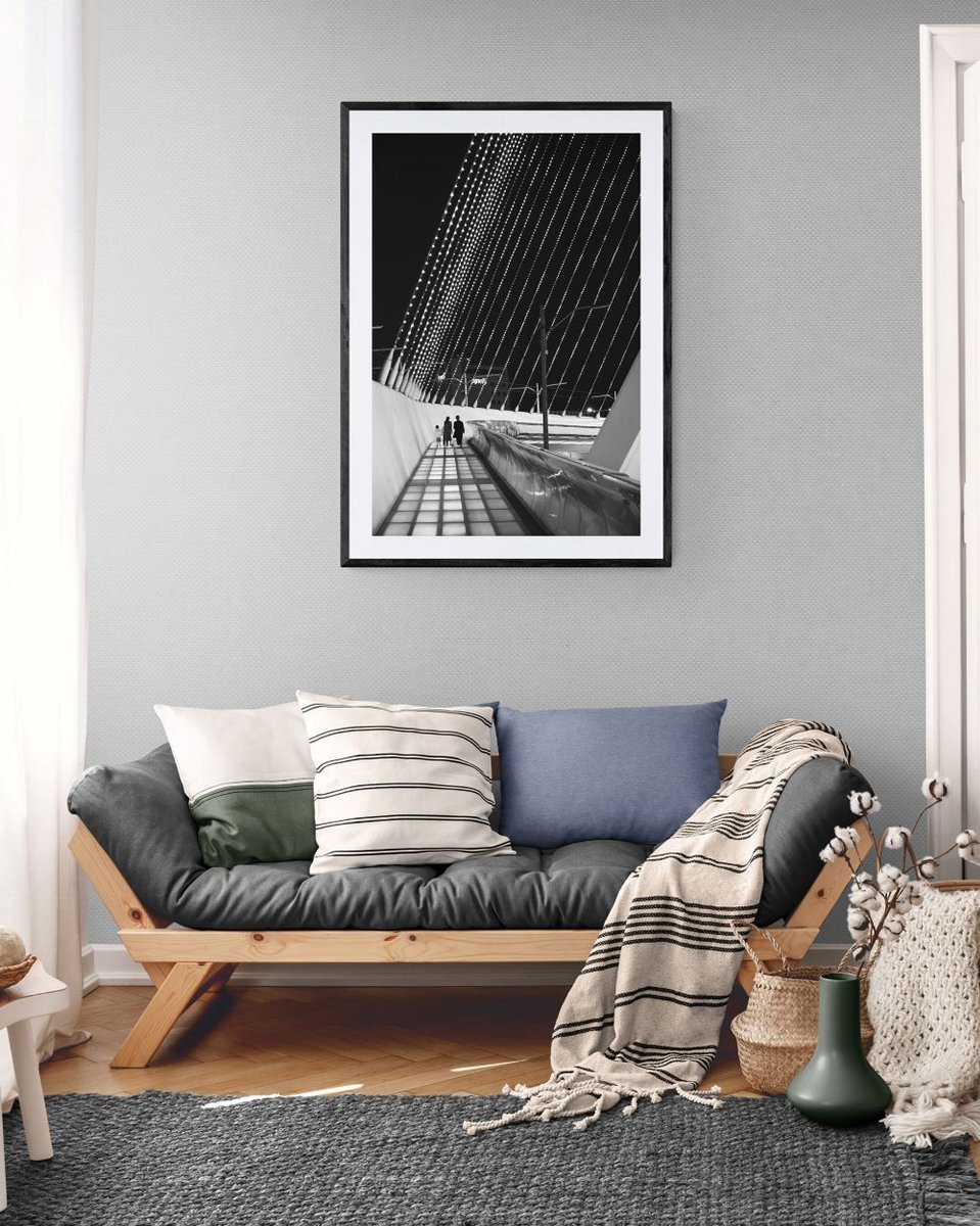 A dramatic Judaica Wall Art Print captured at the entrance to Jerusalem. This black and white photograph documents a Hassidic family returning home after Shabbat, walking beneath the architectural canopy of the bridge’s illuminated cables. The image perfectly fuses Jerusalem’s magic with a profound sense of tradition and family. Available as prints on Photo Paper or Canvas.